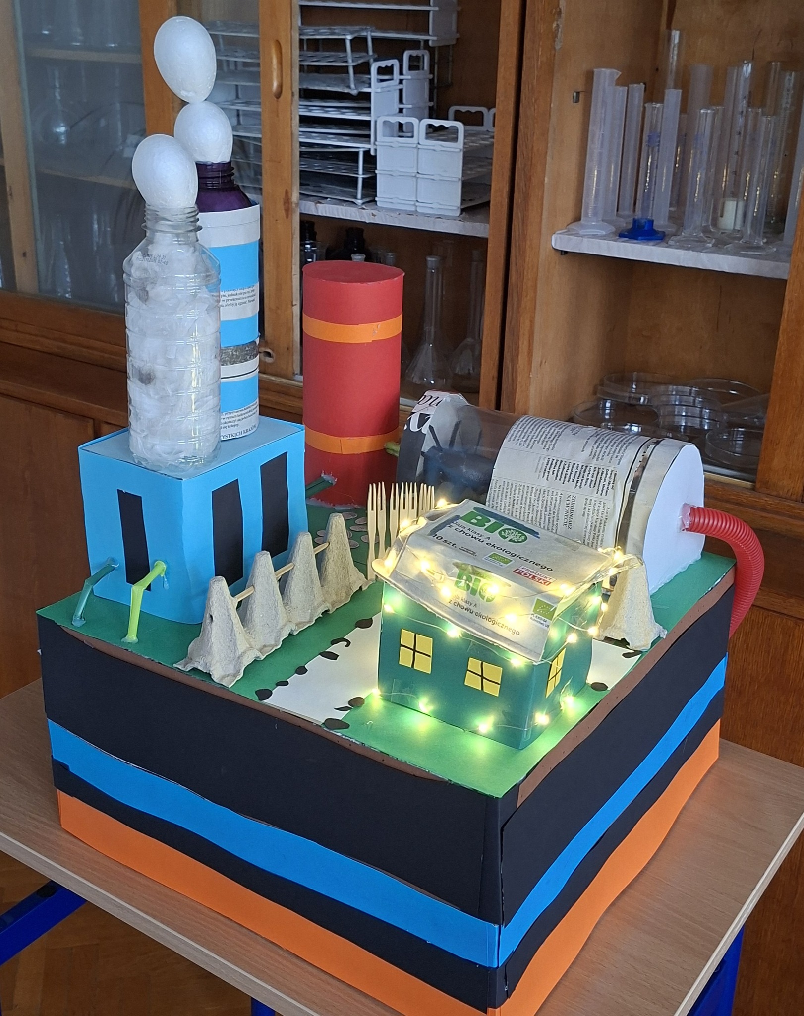 To są zagadnienia omawiane podczas konkursu „Awangarda jutra: sztuka z odzysku” Dwoje uczniów z naszej szkoły podjęło się trudu i udało się zaprojektować proces pozyskiwania energii z wnętrza Ziemi. wykonany w 100% techniką upcyclingu, czyli z materiałów z odzysku, takich jak: karton, plastikowa butelka, rolki po papierze, poniszczone plastikowe rurki, pocięte kolorowe kartki oraz gazety i zużyte opakowania po jajkach razem z patyczkami po szaszłykach czy nieużywane światełka na domku, które imitują światło, wykorzystując energię wytworzoną w elektrowni.