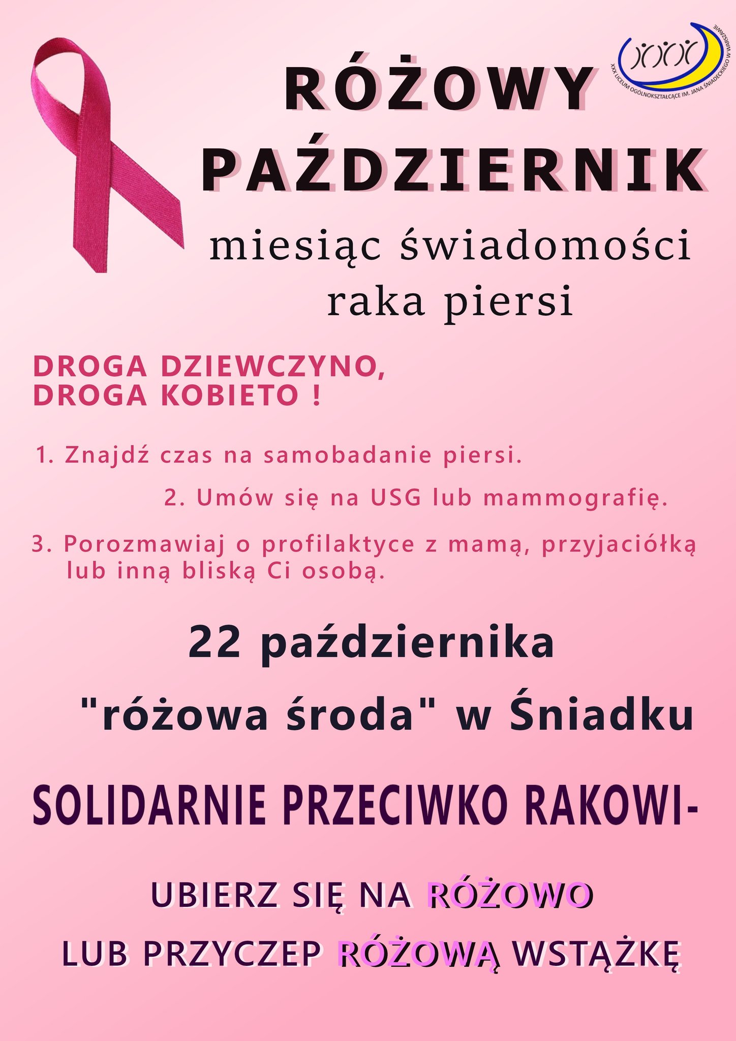 Tradycyjnie w październiku nasza szkoła bierze udział w różowej inicjatywie, która ma na celu zwiększenie świadomości społecznej na temat profilaktyki i wczesnego wykrywania raka piersi.